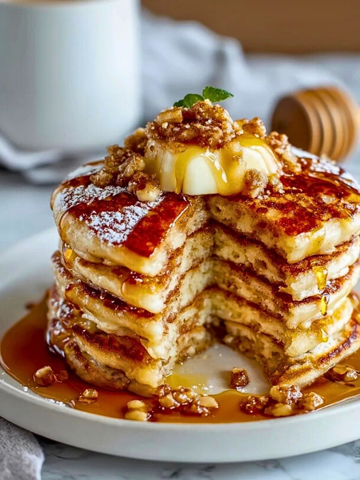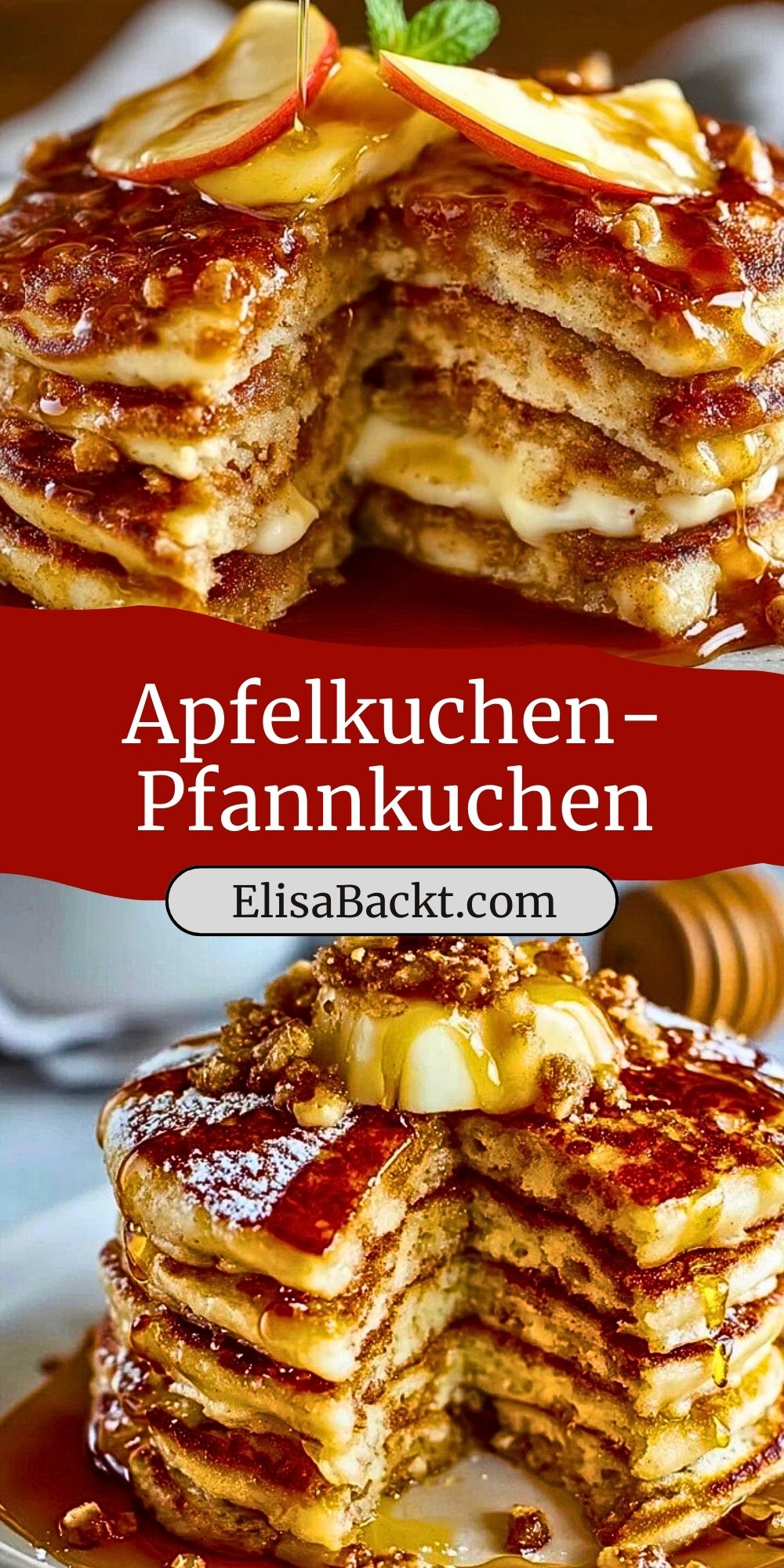 Ein duftender Stapel aus fluffigen Pfannkuchen, gefüllt mit karamellisierten Äpfeln und zarter Quarkcreme – diese Apfelkuchen-Pfannkuchen sind der Inbegriff von Wohlfühl-Frühstück oder Brunch. Jede Schicht ist voll mit herbstlichen Aromen: süß-saure Äpfel, ein Hauch Zimt, etwas Vanille und ein wenig brauner Zucker verschmelzen mit samtigem Teig. Getoppt mit einem Klecks Butter, Ahornsirup und ein paar Apfelscheiben ist das Glück am Frühstückstisch perfekt.