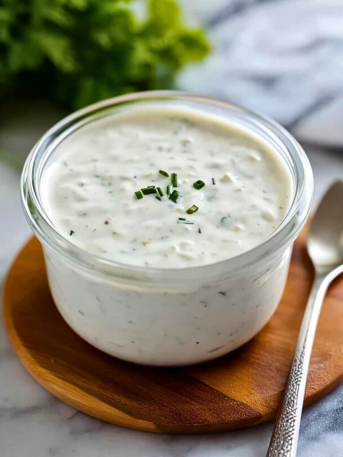 Cremig, frisch und würzig – dieser Ranch-Dressing vereint Joghurt, Mayonnaise, frische Kräuter und einen Hauch Knoblauch zu einem perfekten Dip oder Dressing für Salate, Gemüse und mehr.