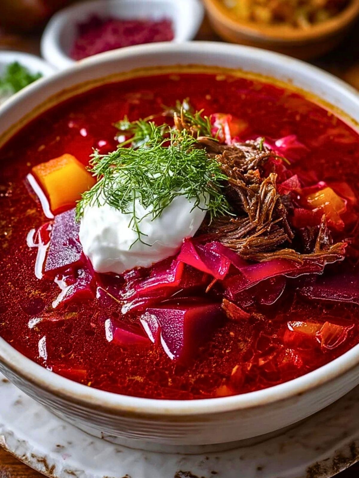 Echter Ukrainischer Borschtsch ist eine farbenfrohe, aromatische Suppe mit Roter Bete, Rindfleisch, Kartoffeln, Weißkohl und Möhren – traditionell serviert mit saurer Sahne und frischem Dill. Perfekt zum Vorbereiten und Aufwärmen, ideal für gemütliche Runden mit Freunden oder Familie!