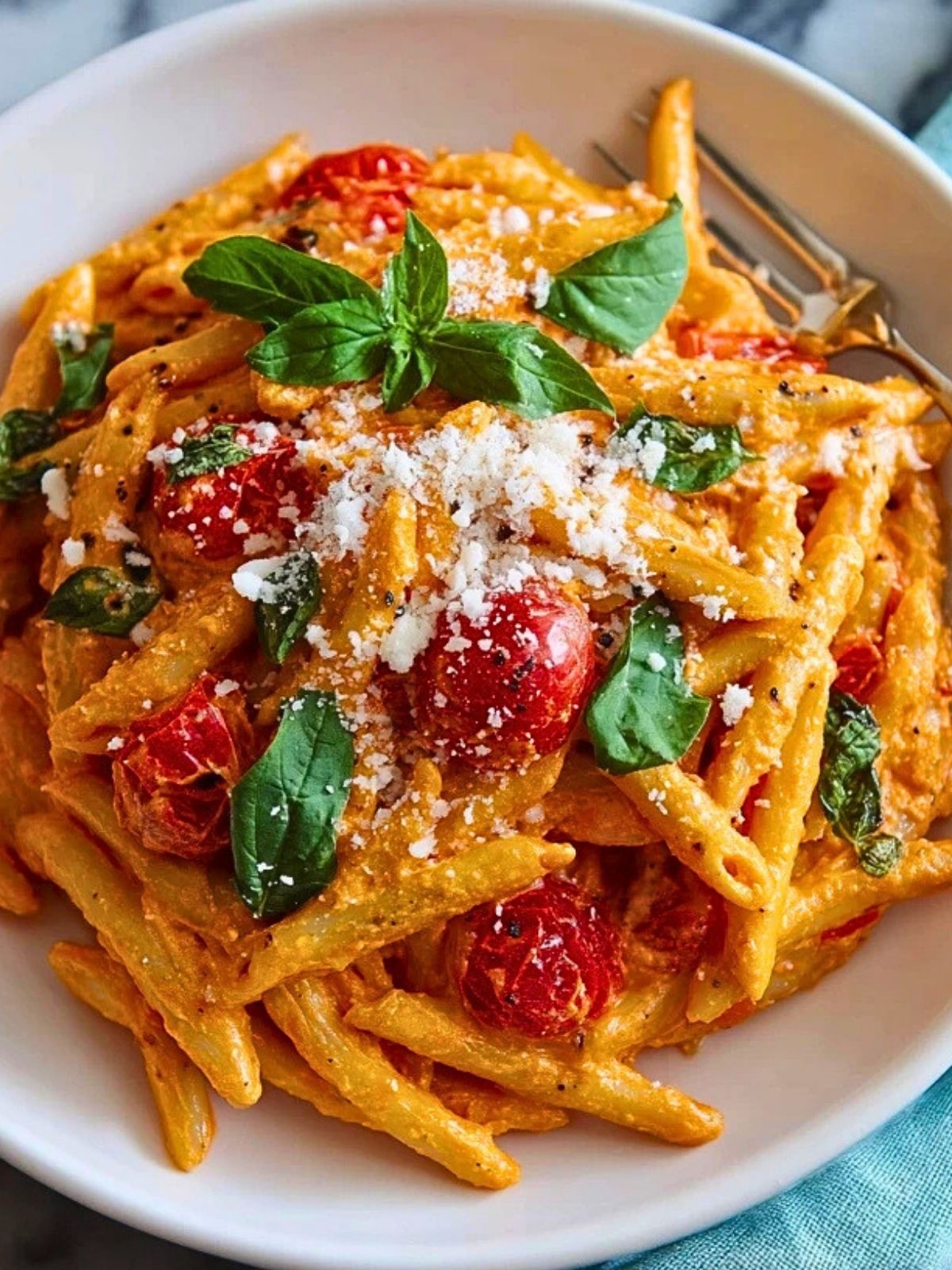 - Ofen-Feta-Pasta mit gebackenen Tomaten.