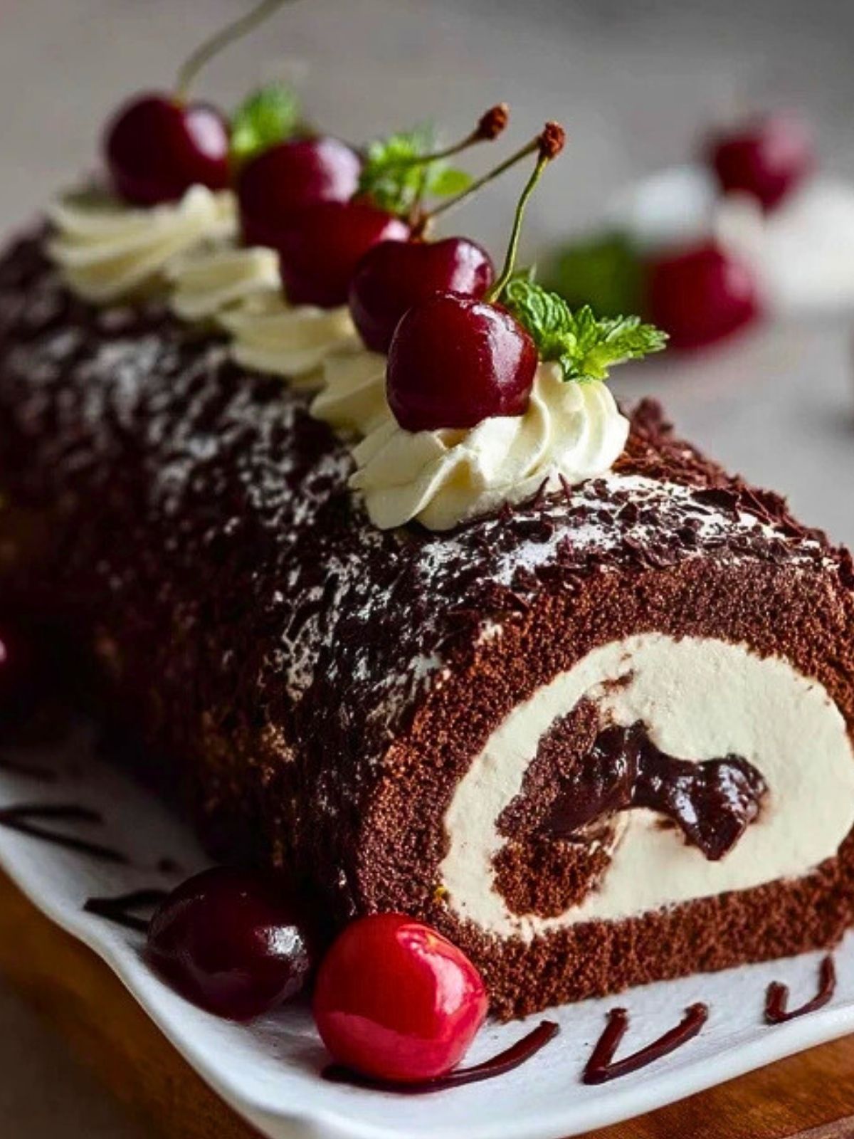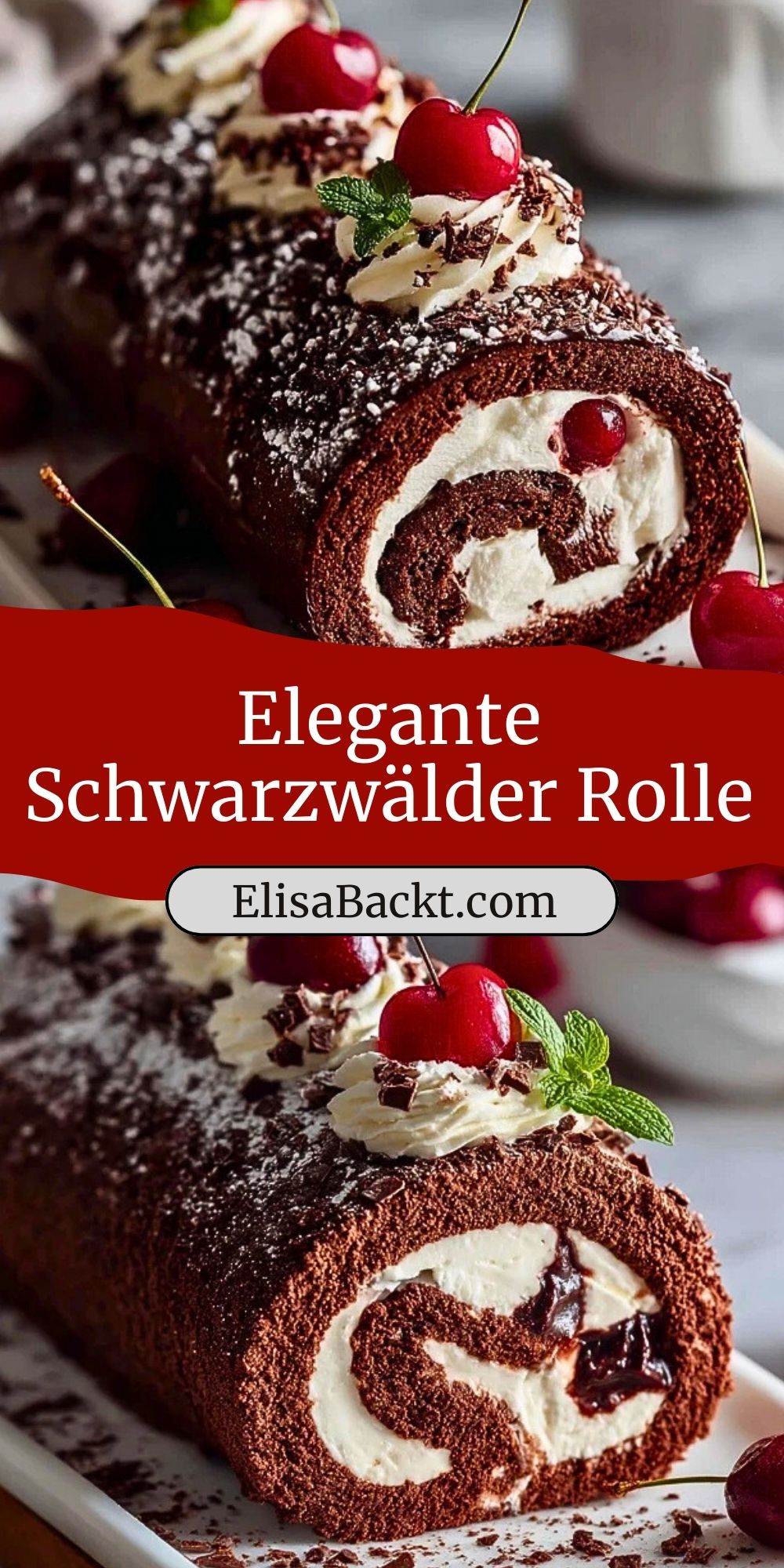 Die Elegante Schwarzwälder Rolle verbindet luftigen Schokoladenbiskuit, eine fruchtige Kirschfüllung und cremige Sahne zu einer raffinierten Variante des Schwarzwälder Klassikers. Perfekt für besondere Anlässe, mit oder ohne Kirschwasser.