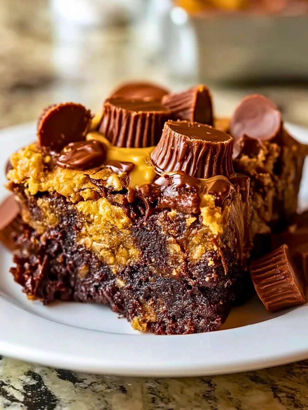 Ein Erdnussbutter-Tassen-Kuchen ist die ultimative Verbindung aus saftigem Schokoladenkuchen, cremigem Karamell und köstlichen Erdnussbutter-Pralinen. Dieses Dessert überzeugt nicht nur durch seinen unwiderstehlichen Geschmack, sondern auch durch seine spektakuläre Optik mit geschmolzener Schokolade, knackigen Keksstreuseln und großzügig verteilten Mini-Erdnussbutter-Tassen. Ob als Hingucker auf dem Kuchenbuffet oder als Highlight für Naschkatzen – dieser Kuchen sorgt garantiert für Begeisterung!