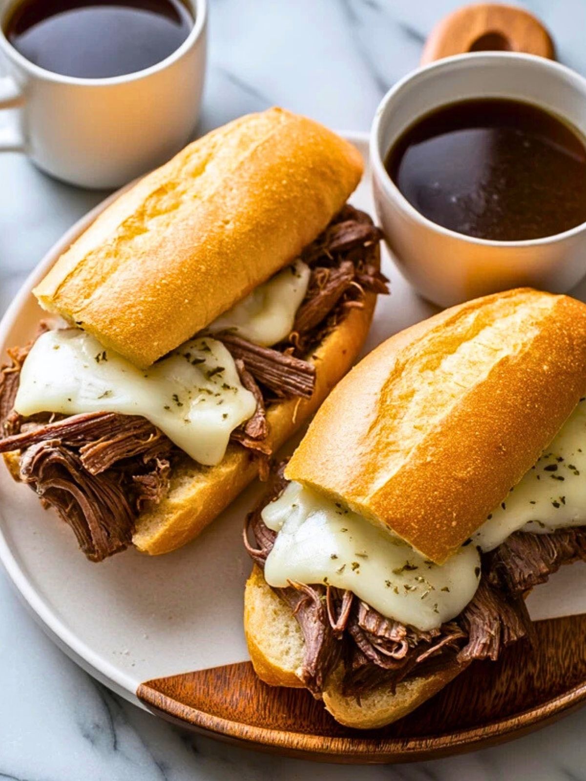 Zartes, langsam geschmortes Rindfleisch, das auf frischen knusprigen Baguettebrötchen mit geschmolzenem Käse serviert wird – das sind Französische Dip-Sandwiches aus dem Slow Cooker! Die köstliche Brühe („Au Jus“), die beim Schmoren entsteht, wird als würziger Dip gereicht und macht dieses Rezept zu einem echten Wohlfühlessen für kalte Tage, gemütliche Abende oder einen besonderen Snack mit Freunden.