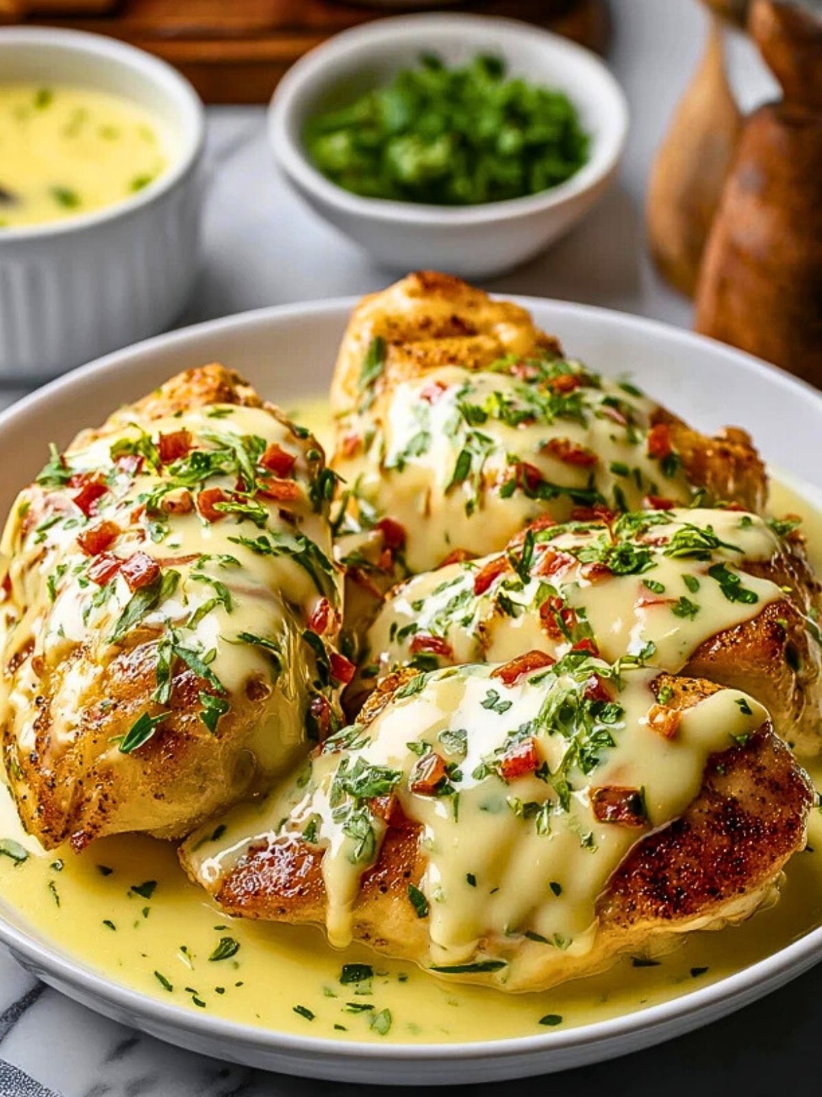 Saftig gebratenes Hähnchenfilet trifft auf eine cremige, würzige Käsesoße – ein Gericht, das auf jedem Tisch für Begeisterung sorgt. Die geschmolzene Käsekruste, verfeinert mit frischen Kräutern und bunten Paprikawürfeln, macht dieses Hähnchen zu einem echten Wohlfühlessen. Perfekt für Familienabende oder Gäste, die du beeindrucken möchtest.