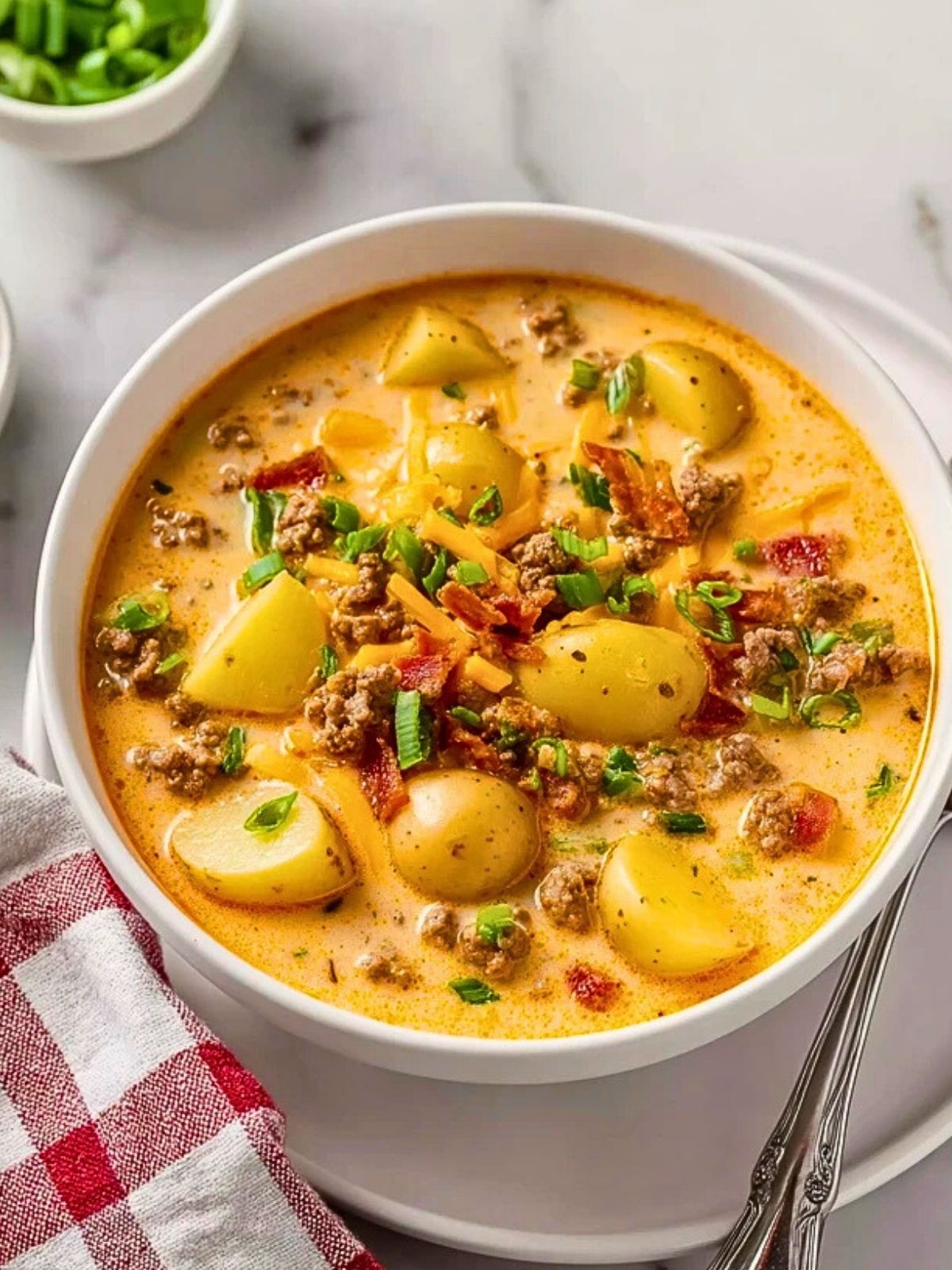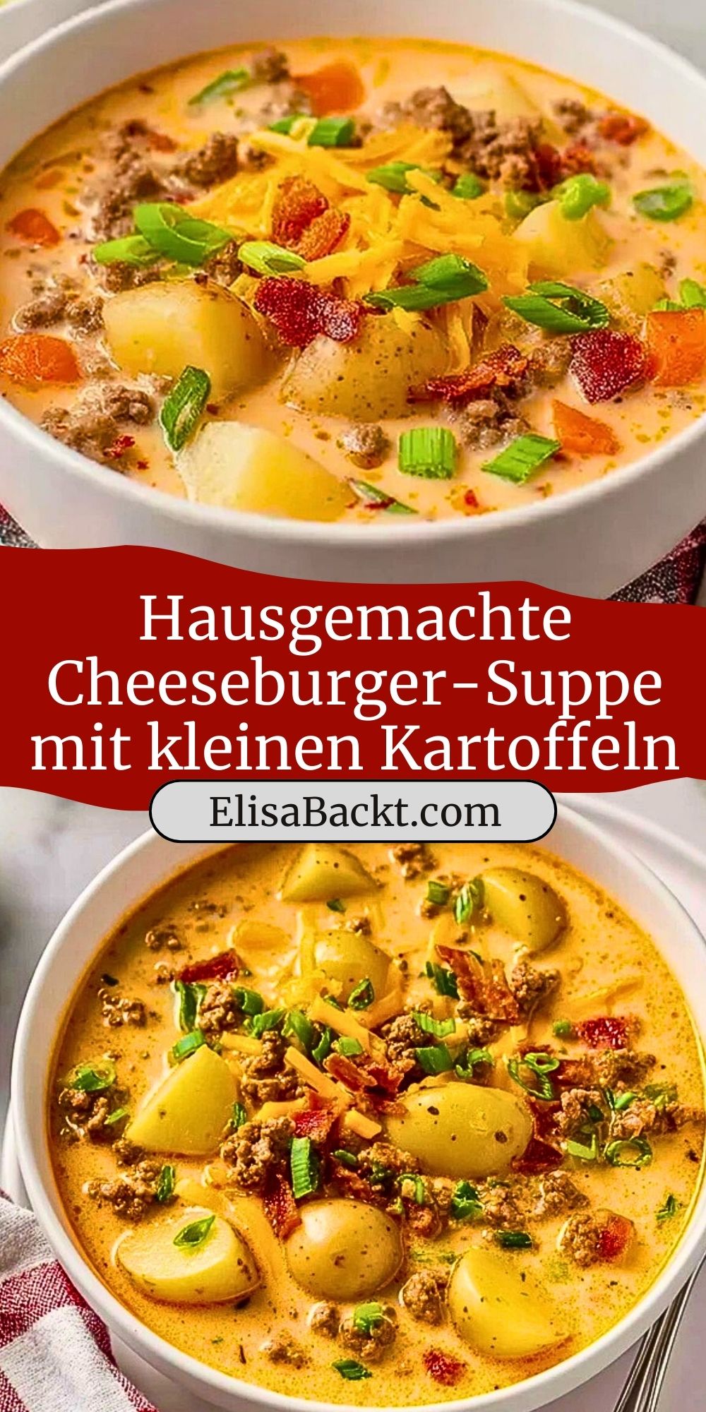 Cremige, herzhafte Cheeseburger-Suppe mit würzigem Hackfleisch, kleinen Kartoffeln, Gemüse und viel Käse – getoppt mit knusprigem Bacon und frischen Frühlingszwiebeln. Perfekt für die kalte Jahreszeit und als sättigendes Familienessen!