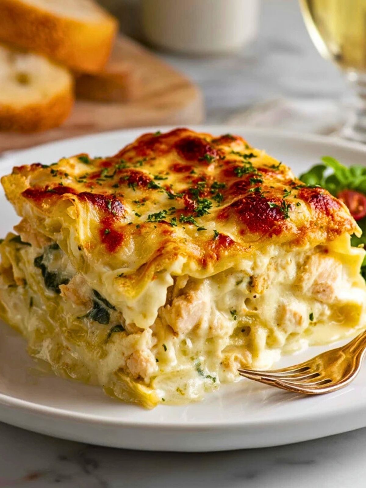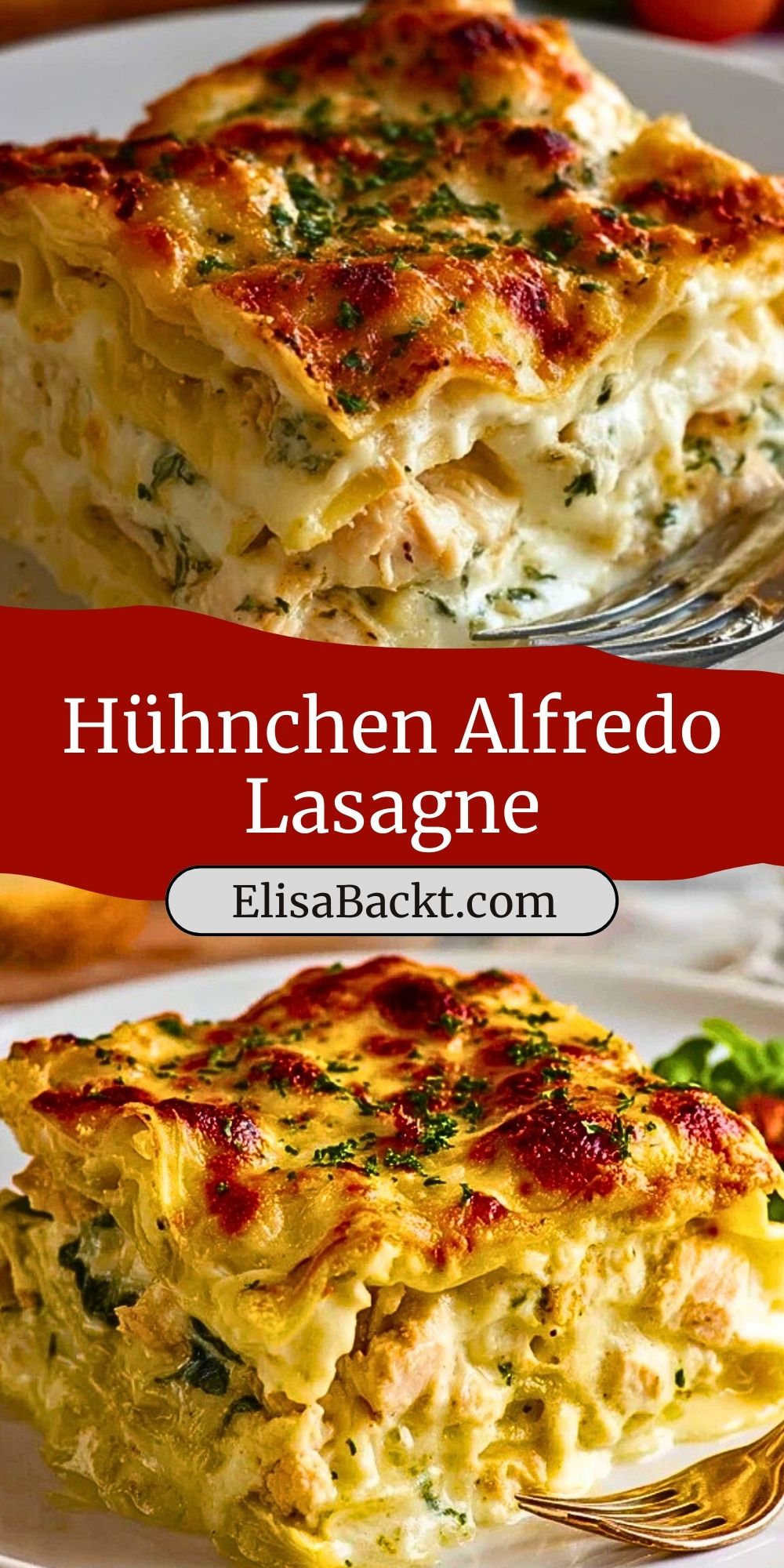 Cremige Hühnchen Alfredo Lasagne mit zartem Hähnchen, würzigem Spinat und reichhaltiger Käseschicht – ein echtes Wohlfühlgericht, das Gäste wie Familie gleichermaßen begeistert!