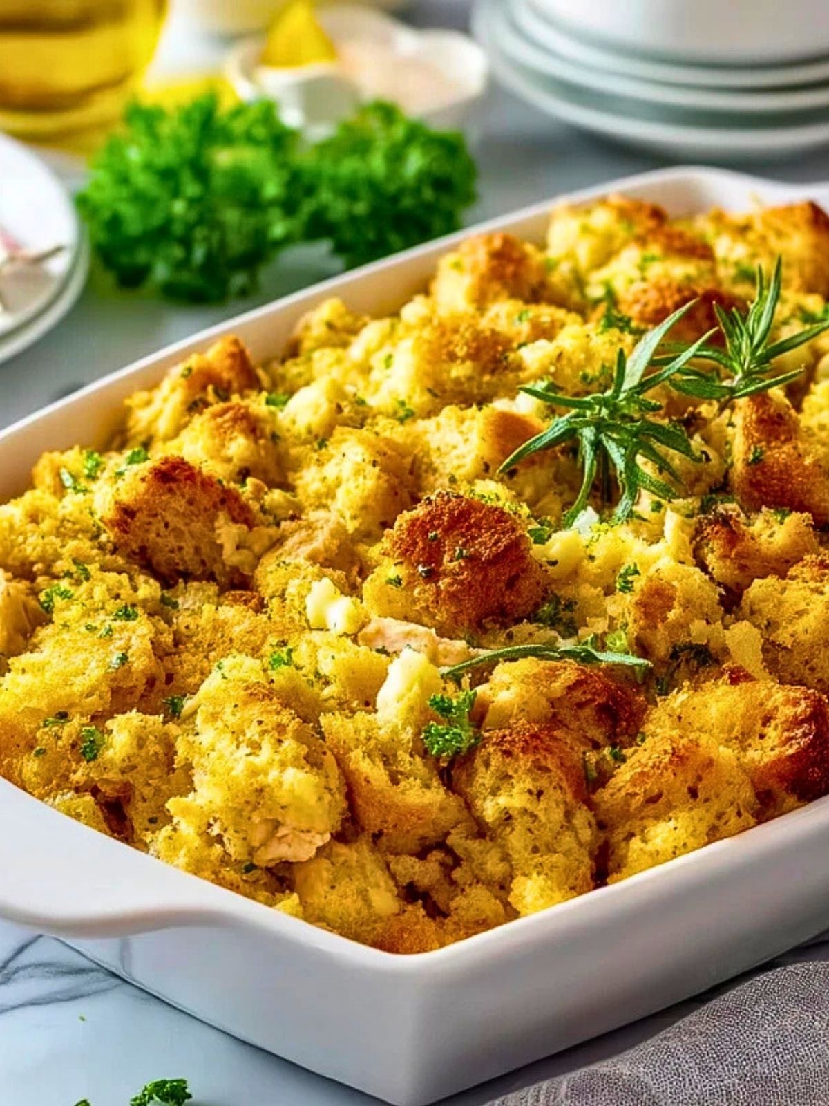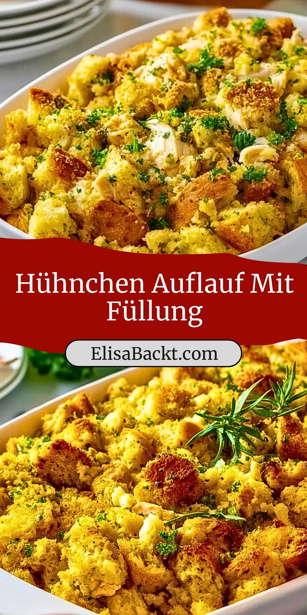 Herzhafter Hühnchen Auflauf mit Füllung: Zartes Hähnchenfilet trifft auf eine aromatische Brot-Gemüse-Füllung und wird im Ofen goldbraun gebacken. Perfekt für gemütliche Familienessen oder zum Resteverwerten.