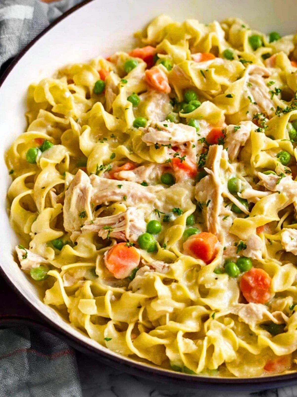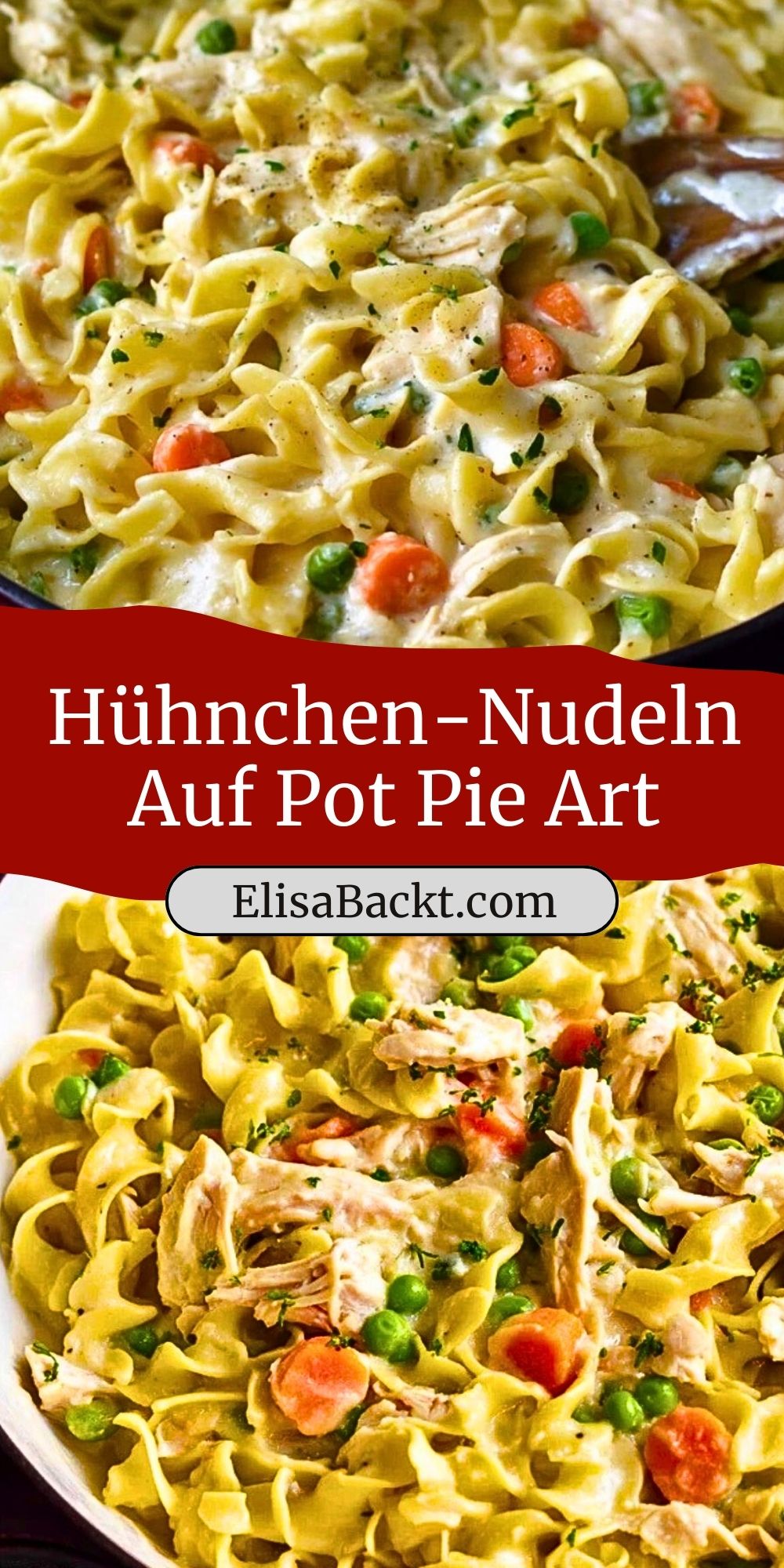 Cremige Hühnchen-Nudeln Auf Pot Pie Art: Zarte Eiernudeln, würzige Hähnchenstücke, knackiges Gemüse und eine sämige Sauce – alles aus einer Pfanne! Perfekt für Familienabende und zum Reste-Verwerten. In weniger als 40 Minuten auf dem Tisch und einfach unwiderstehlich!
