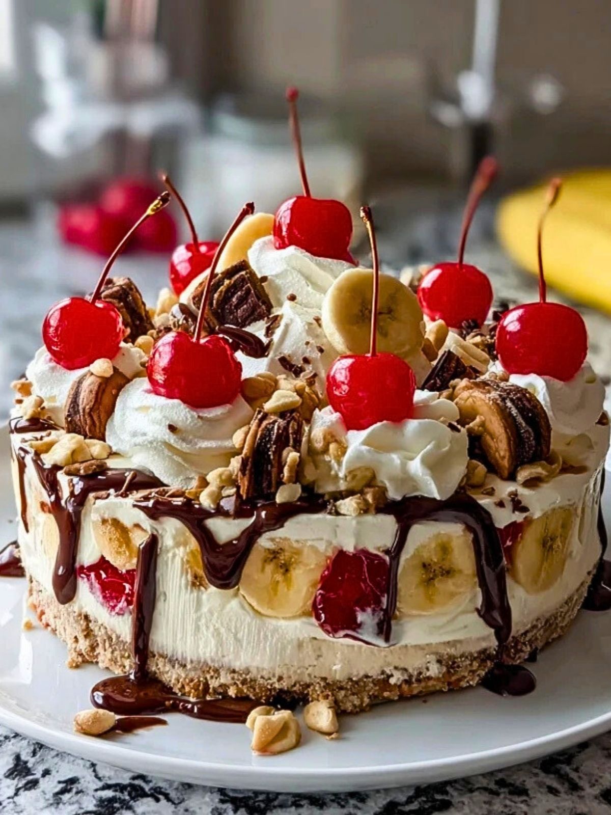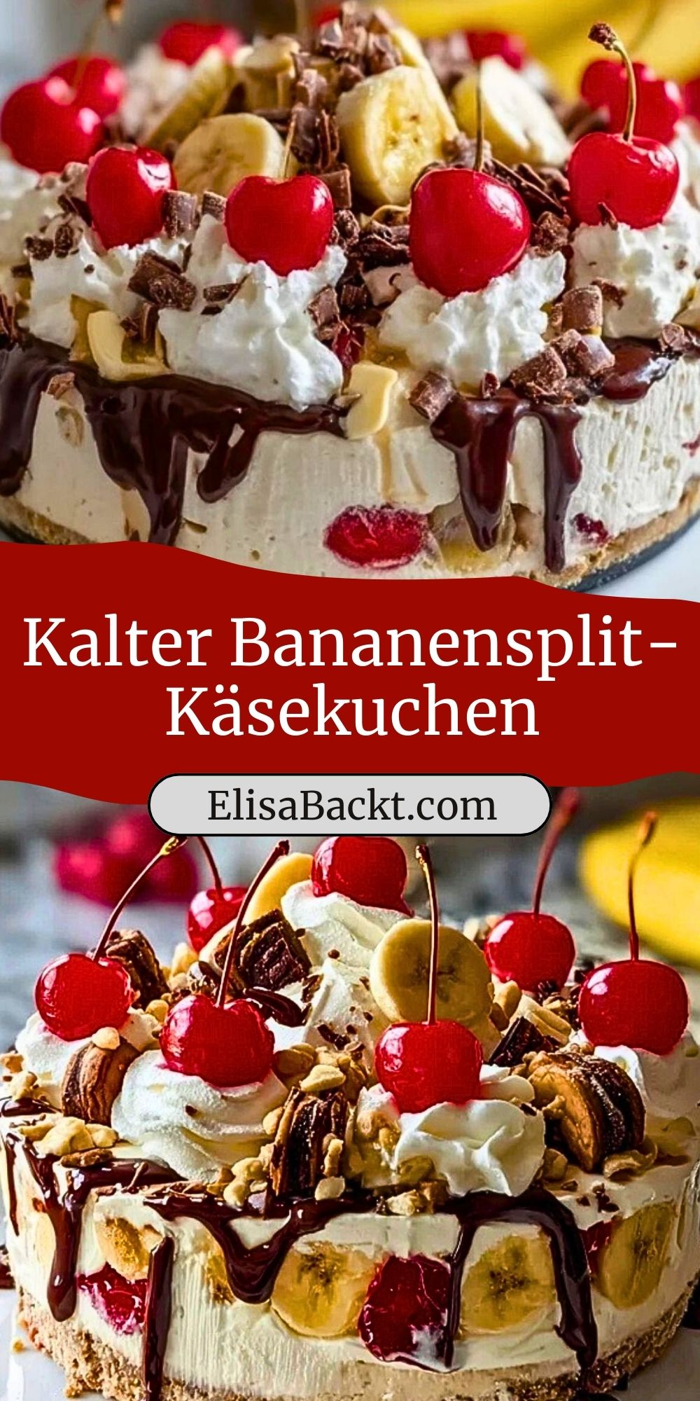 Ein herrlich cremiger No-Bake-Käsekuchen, inspiriert vom klassischen Bananensplit! Mit Keksboden, einer luftigen Frischkäsecreme, frischen Bananen, Erdbeeren, Kirschen und einem Schoko-Topping – perfekt für warme Tage oder als Highlight auf dem Kuchenbuffet.