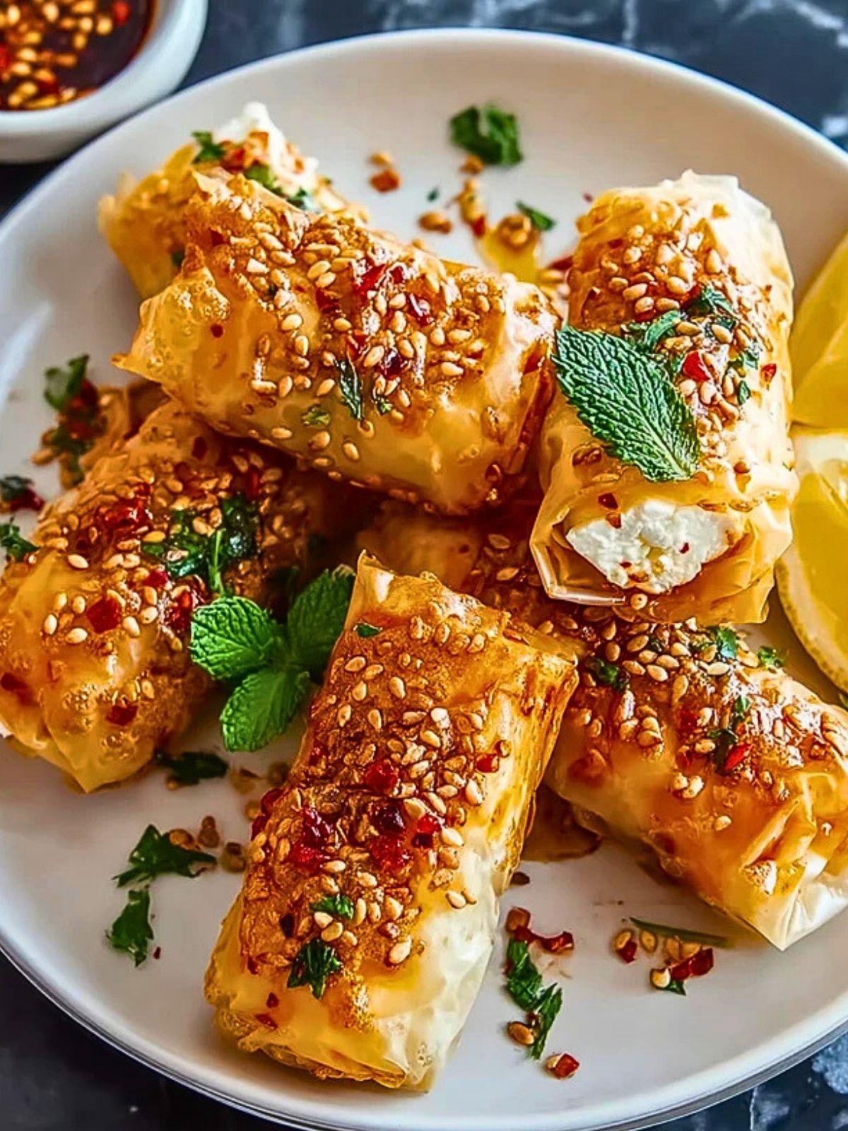Ofenfrittierte Feta-Rollen mit Chili-Honig