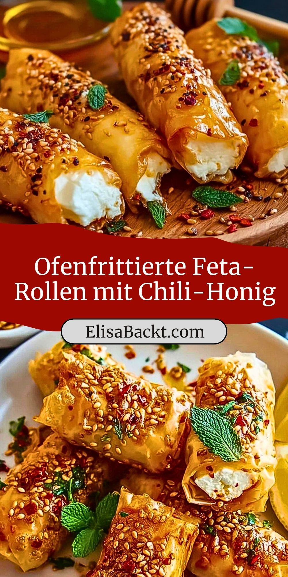 Knuspriger Genuss aus dem Ofen: Diese ofenfrittierten Feta-Rollen mit Chili-Honig sind das perfekte Zusammenspiel aus cremig, würzig und süß-scharf. Der salzige Feta wird von hauchdünnem Filoteig umhüllt, goldbraun gebacken und anschließend mit einem aromatischen Chili-Honig überzogen. Ein Hauch Sesam sorgt für einen nussigen Crunch und rundet das Geschmackserlebnis ab.