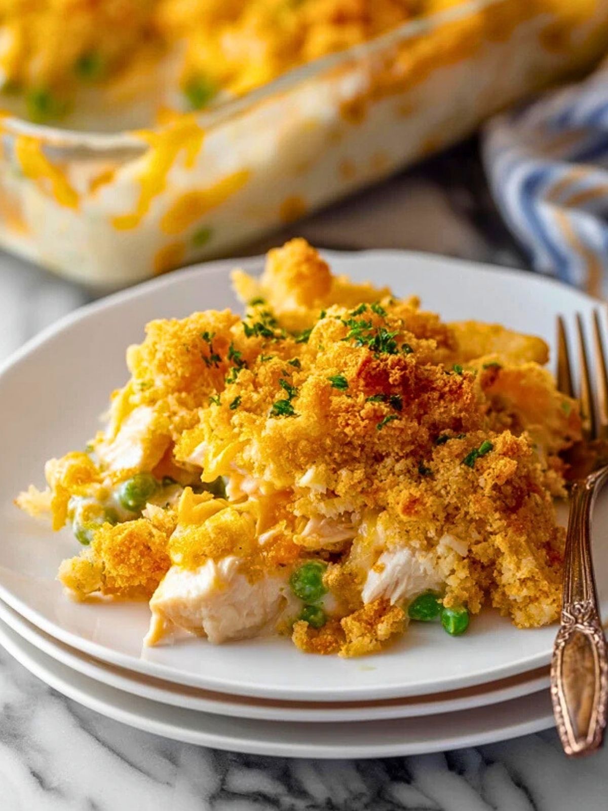 Ob du übrig gebliebenes Hähnchenfleisch verwendest oder eigens welches kochst – der Auflauf lässt sich wunderbar vorbereiten und schmeckt auch am nächsten Tag noch hervorragend. Der knusprige Topping-Kontrast zur cremigen Füllung macht diesen Auflauf zu einem echten Klassiker, den du immer wieder genießen willst.