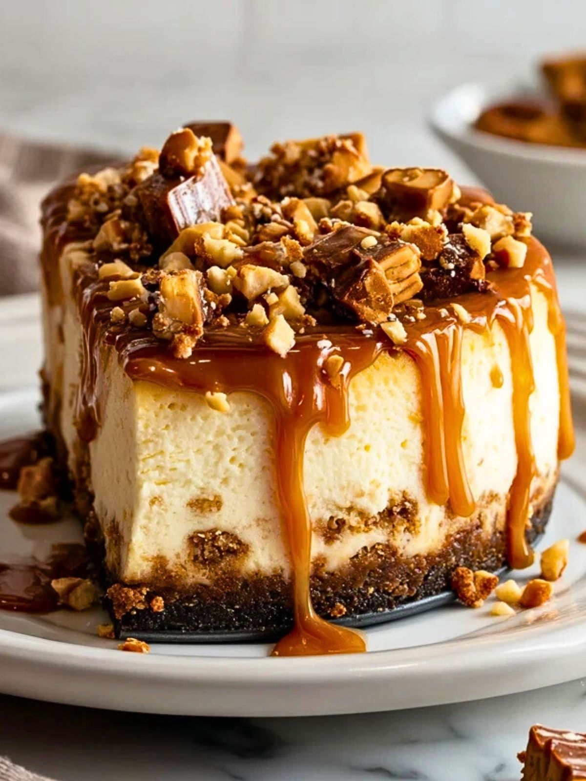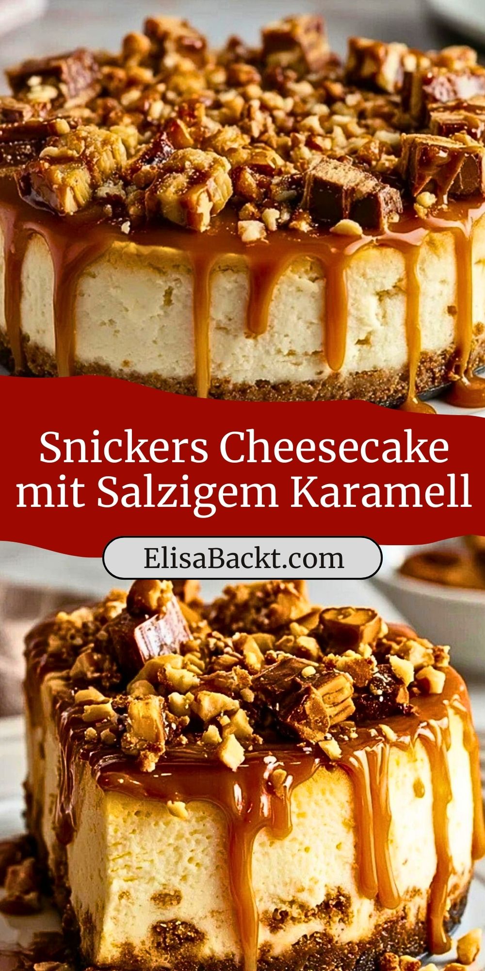 Cremiger Snickers Cheesecake mit Keksboden, echten Snickers-Stückchen und einer köstlichen Schicht aus salzigem Karamell. Perfekt für jeden Anlass – ein unvergesslicher Käsekuchen für alle, die Schokolade, Erdnüsse und Karamell lieben!